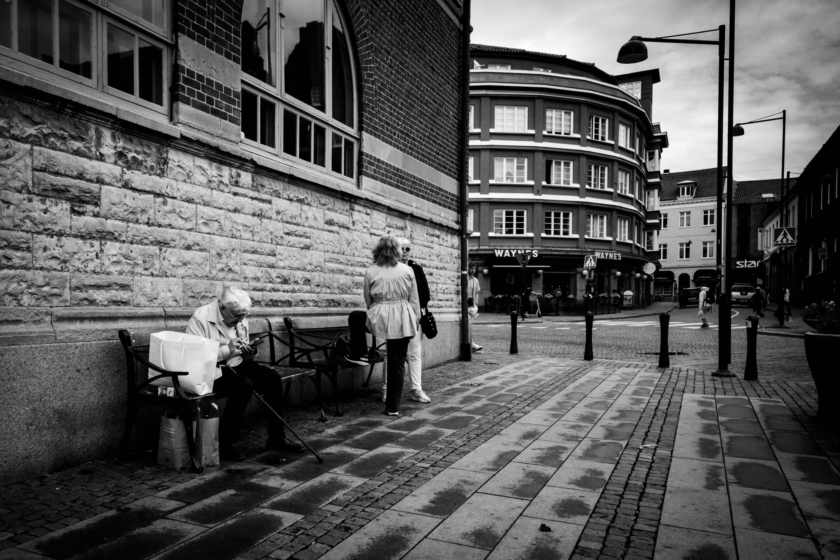 När jag kom ut från Saluhallen i Lund såg jag kvinnan på bänken. Hon såg ut att skriva ett SMS på sin telefon. Kanske var det någon som skulle komma och hämta henne och hennes påsar.