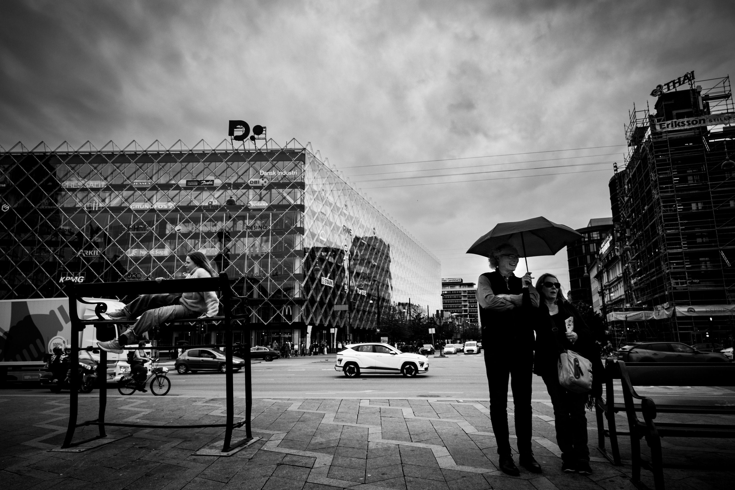 Det duggar lite i luften på torget i Köpenhamn. I ena änden står ett par och betraktar folkvimlet. Jag reagerade på att kvinnan höll i det minimala paraplyet - över mannen som står och ler.